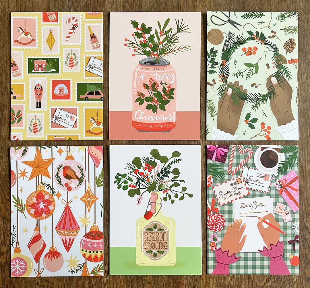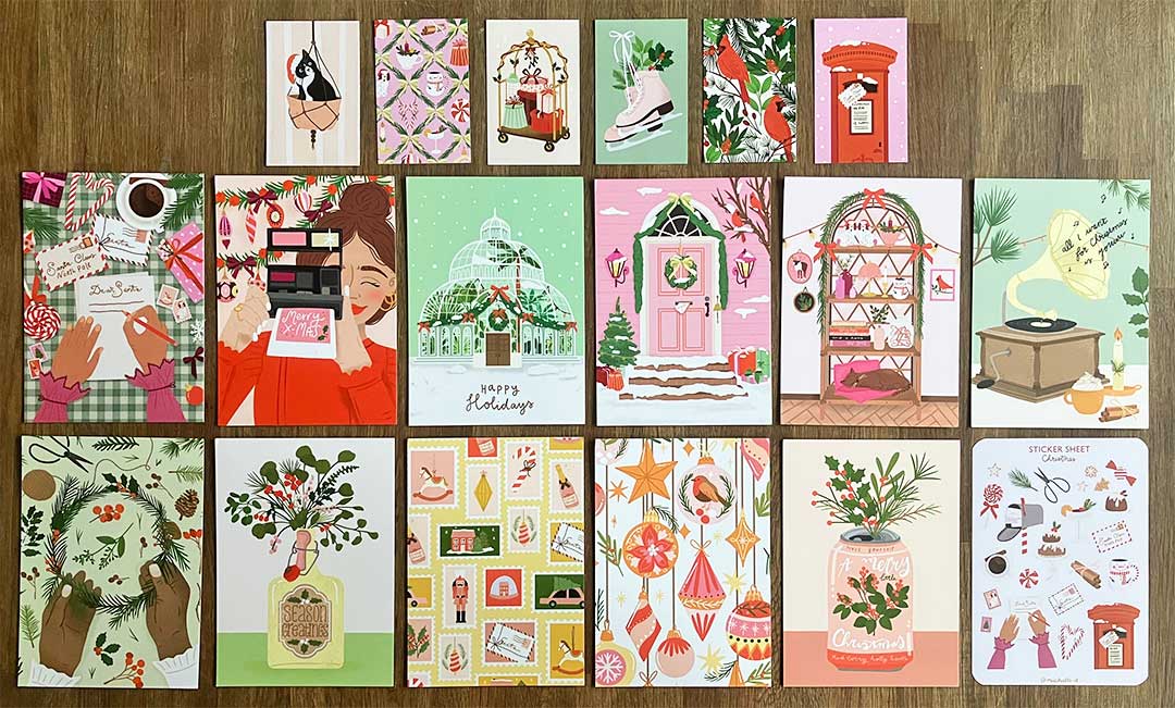 Ik ken Romy al een aantal jaar. Ik heb haar zien evalueren van illustraties die met waterverf zijn gemaakt en vervolgens zijn gescand naar de digitale tekeningen die het nu zijn. Uiteraard nog steeds geheel in haar eigen stijl. Ze brengt al enkele jaren kerstcollecties uit, maar sinds 3 of 4 jaar pas zo uitgebreid als nu. Iedere kaart heeft een uniek ontwerp. Overige artikelen die zijn gedrukt sluit aan bij een van deze ontwerpen. Echter zijn er wel thema’s terug te vinden in de reeks. Op de beelden die je foto’s uit 2023 en 2024. Zo zie je een meisje in beeld, handen die bezig zijn, patronen en kerststukjes in een houder die anders is dan een standaard vaas. De kerstcollectie van Muchable bevat ook teksten en andere taferelen maar die spraken mij persoonlijk minder aan. Er is gelukkig voor ieder wat wils.