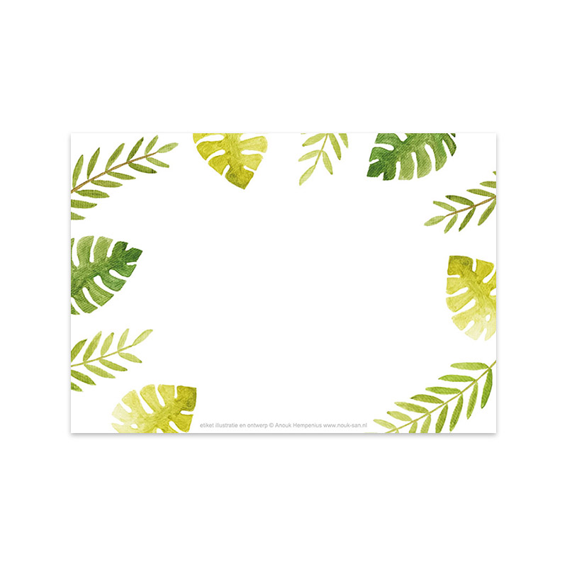 Deze set adresstickers van Nouk-san bestaat uit 5 etiketten op A7 formaat. Ze zijn gedrukt op 90 grams gerecycled wit plakpapier en bevatten groene tinten. De stickers hebben een gesplitte papieren achterkant waardoor je ze gemakkelijk van het papier af kunt halen. De etiketten zijn ideaal om op een effen kleur enveloppen te plakken en het adres van de ontvanger op te schrijven.