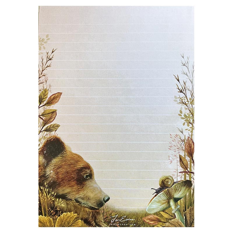 Brieven versturen in de herfst? Gebruik dit prachtige gelinieerde briefpapier met illustraties van een beer in de natuur en een slak op een paddenstoel op de voor- en achterkant.