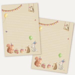 Is jouw penvriendin jarig? Gebruik dit feestelijke gelinieerde briefpapier met illustraties van een eekhoorn, een egel, een konijn, een vogeltje op een schommel, een slinger, ballonnen en wat eten op de voor- en achterkant.