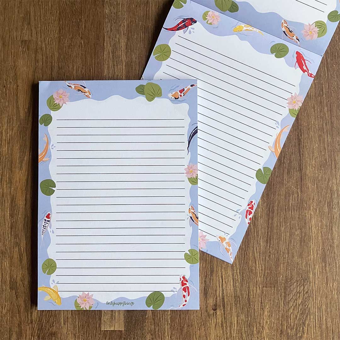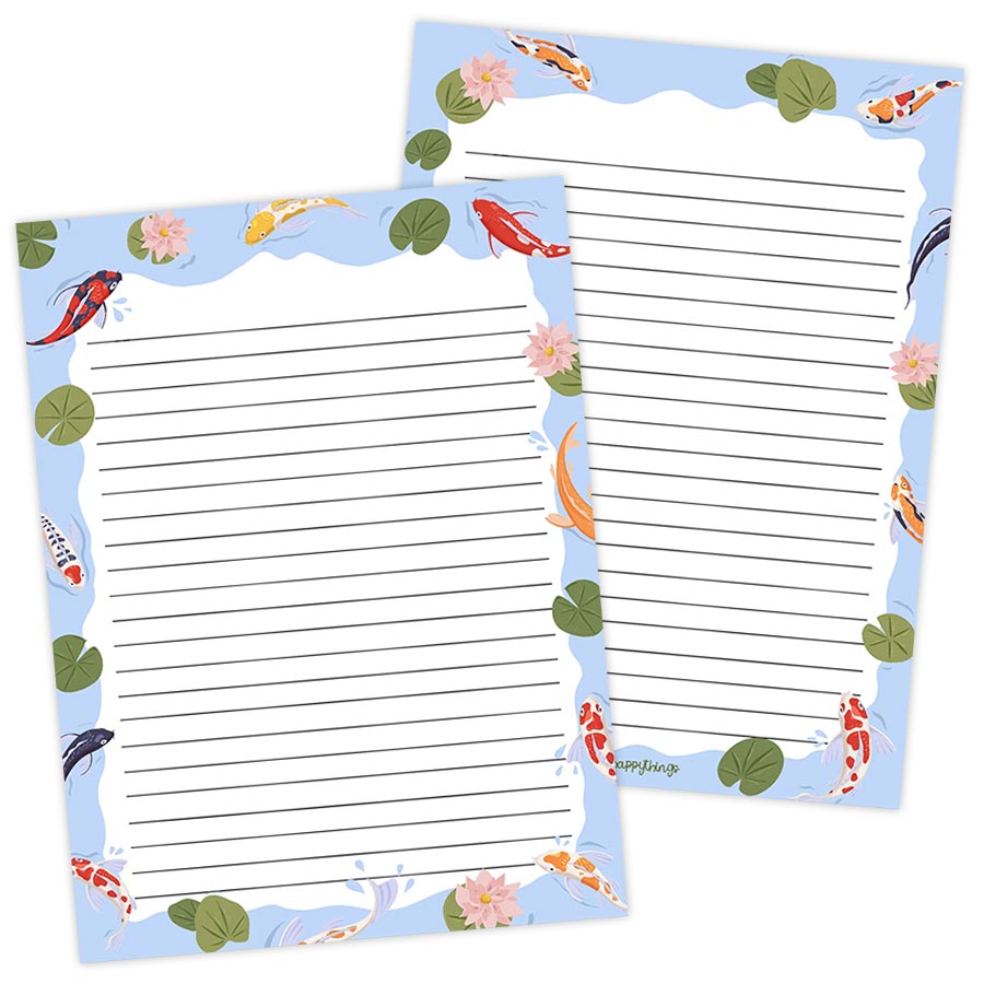 Houd je penvriendin van vissen? Gebruik dit prachtige gelinieerde briefpapier met illustraties van koi vissen en leliebladen op de voor- en achterkant.