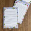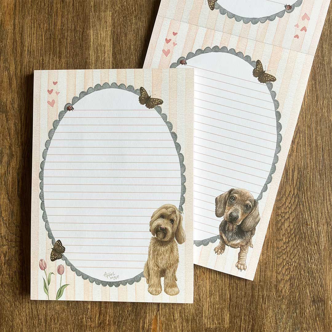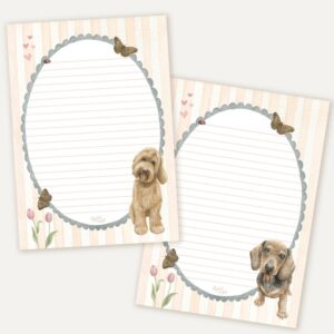 Is jouw penvriendin een hondenliefhebber? Gebruik dit prachtige gelinieerde briefpapier met illustraties van een labradoodle met vlinders en bloemen op de voorkant en een teckel op de achterkant.