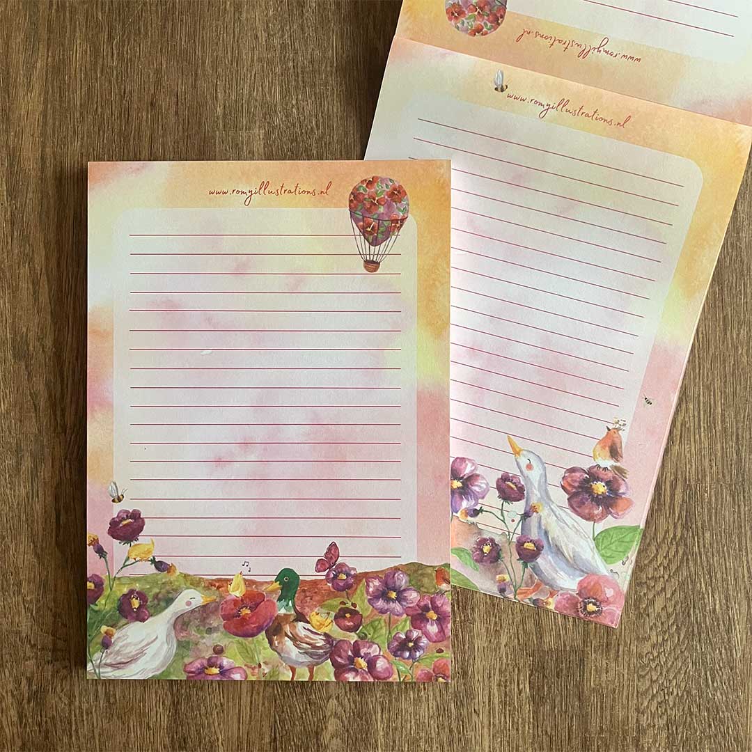 Dit briefpapier van Romy illustrations is een gelijmd blok met 50 vellen op A5 formaat. Het is gedrukt op 120 grams offset papier en bevat groene, paarse en oranje tinten. Het blok is dubbelzijdig bedrukt. De vellen papier zijn uitermate geschikt als briefpapier, maar kunnen ook worden ingezet voor onder andere lijstjes en notities. Verkrijgbaar als blok van 50 vellen en setjes met 10 vellen.