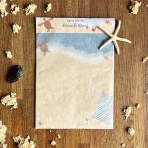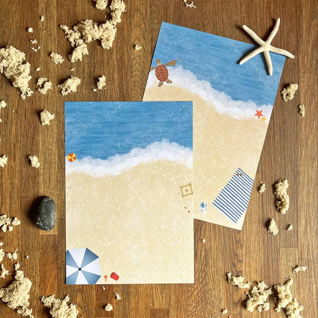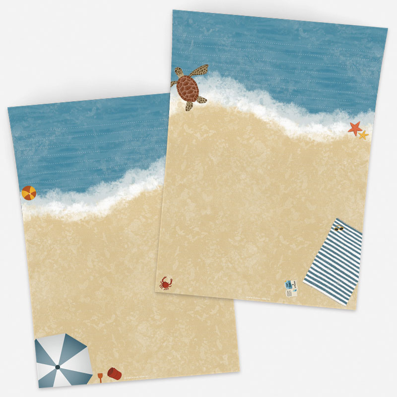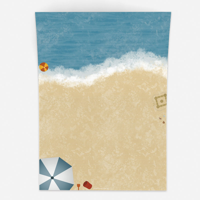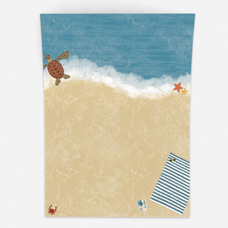Werk je correspondentie bij op het strand! Gebruik dit gelinieerde briefpapier met illustraties van een zeeschildpad, een badhanddoek, een strandbal, een parasol, een zandkasteel en zeesterren op een achtergrond van een strand.