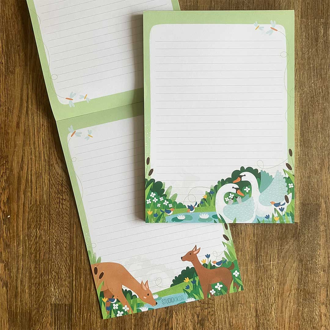 Dit dubbelzijdige briefpapier van Studio Kikor is een gelijmd blok met 50 vellen op A5 formaat. Het is gedrukt op 80 grams offset papier en bevat groene, blauwe, witte en bruine tinten. Het blok is dubbelzijdig bedrukt. De vellen papier zijn uitermate geschikt als briefpapier, maar kunnen ook worden ingezet voor onder andere lijstjes en notities. Verkrijgbaar als blok van 50 vellen en setjes met 10 vellen.