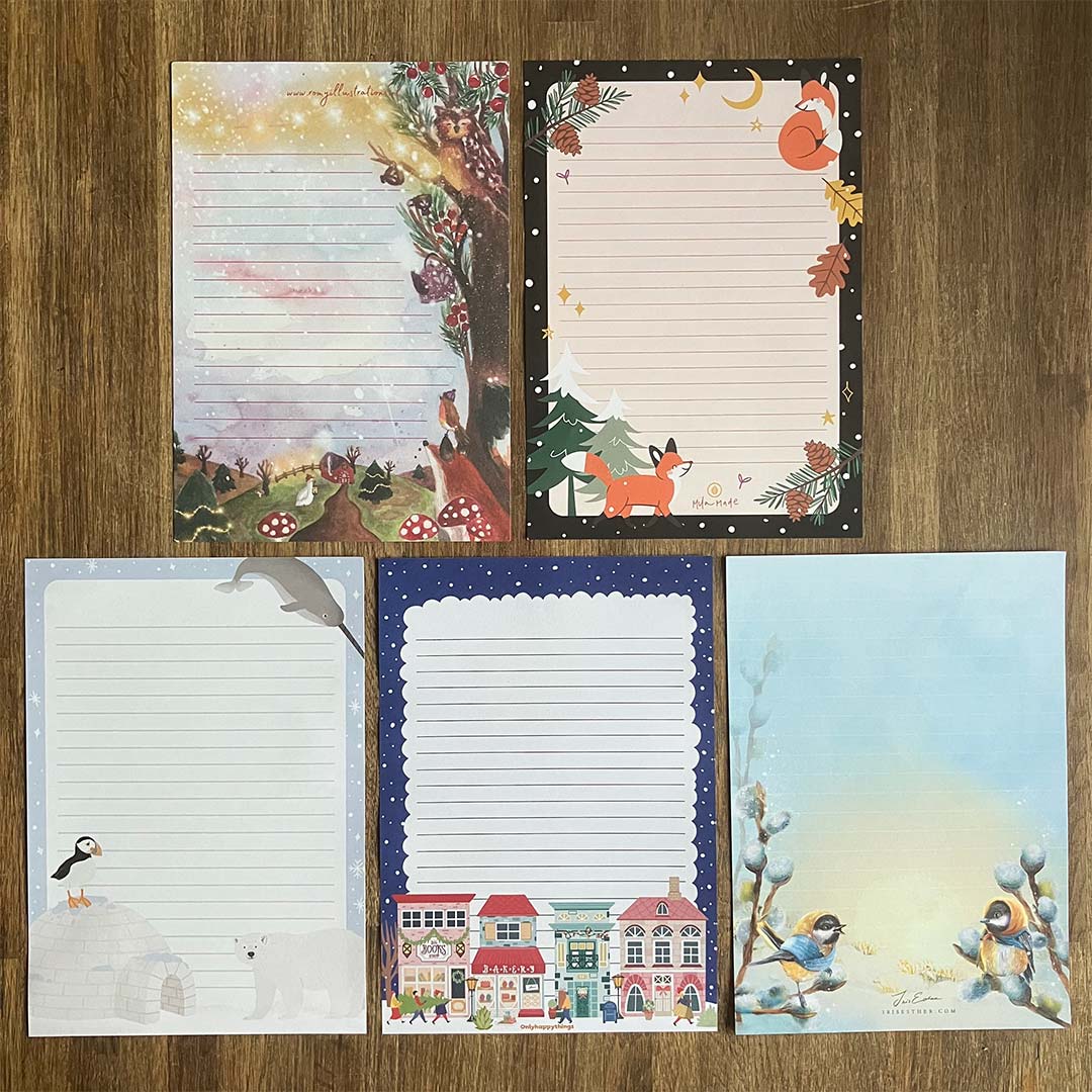 Deze themaset bestaat uit 5 verschillende ontwerpen briefpapier: magisch lichtjeswoud van Romy illustrations, winter fox van Mila Made, winterdieren van Muchable, winter village van Only Happy Things en chickadees van Iris Esther. De set bevat 5 vellen van ieder ontwerp. Het dubbelzijdige briefpapier is gedrukt op 90 of 120 grams offset papier van A5 formaat. De set is ideaal om meerdere soortgelijke ontwerpen in huis te halen zonder hele grote aantallen te hoeven bestellen. De themaset is verpakt in een pergamijn zakje zodat je het briefpapier mooi kunt bewaren.