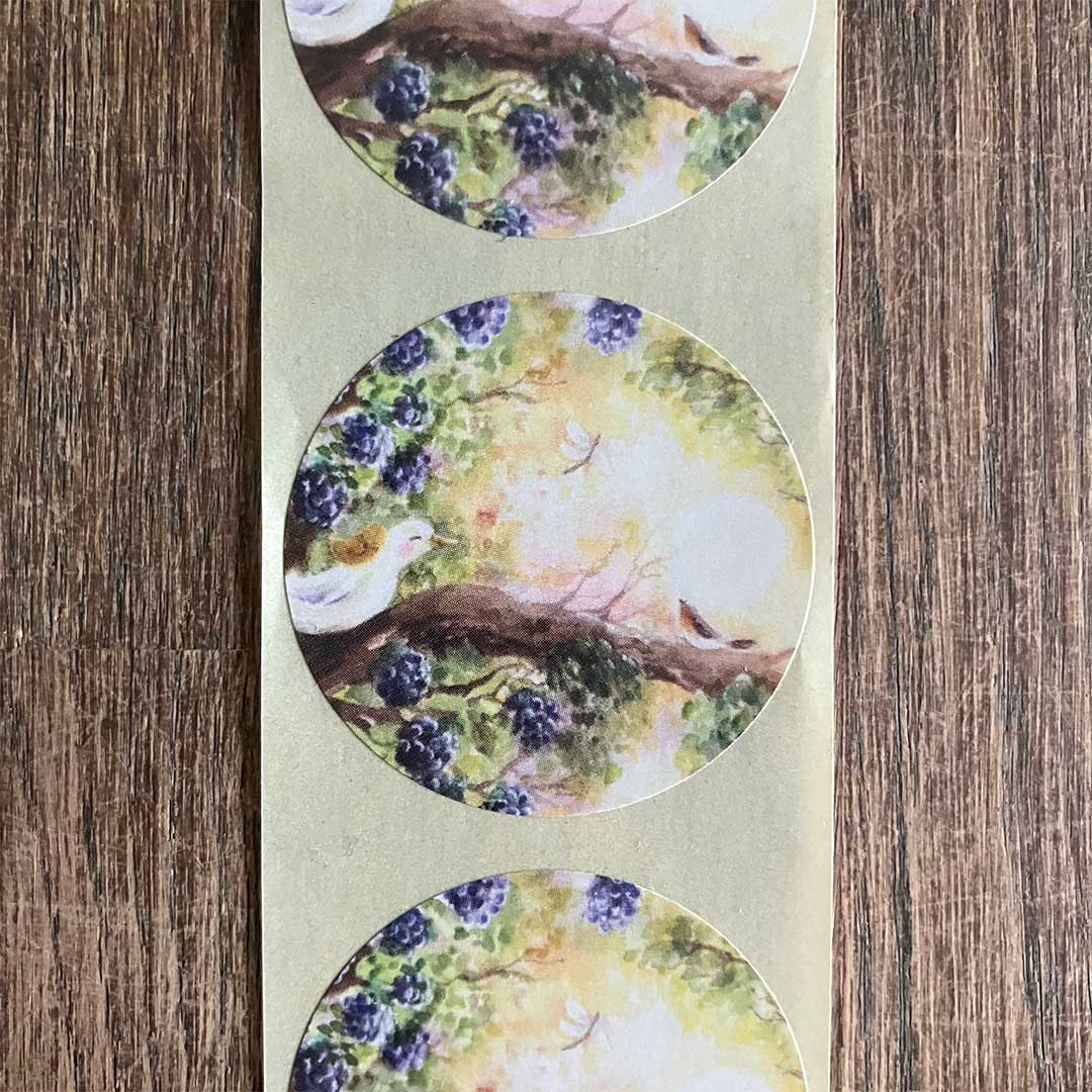 Wil jij jouw enveloppen mooi dicht maken? Gebruik deze sluitzegel met illustraties van een vogel op een tak met bladeren en bessen in de zon.