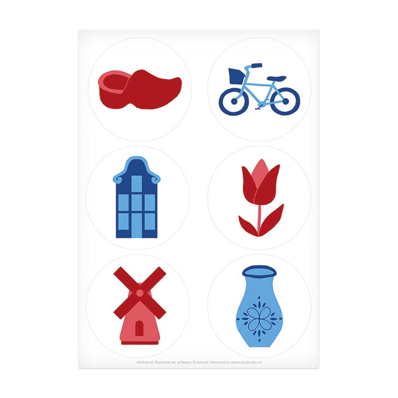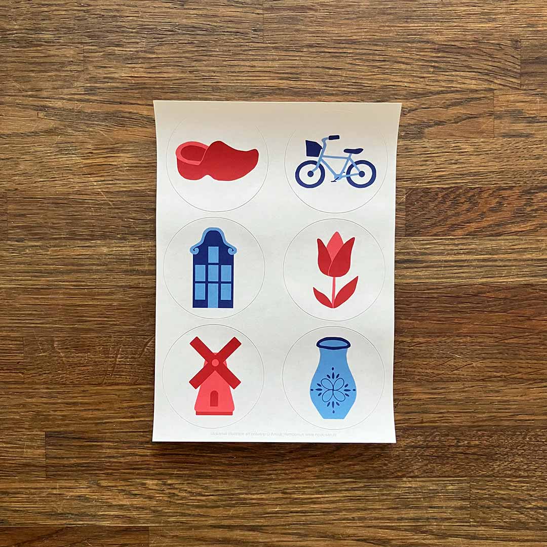 Vind jouw penmaatje het thema Holland leuk? Gebruik deze sluitzegel met illustraties van een klomp, een fiets, een grachtenpand, een tulp, een molen en een vaas om je enveloppen mee dicht te maken.